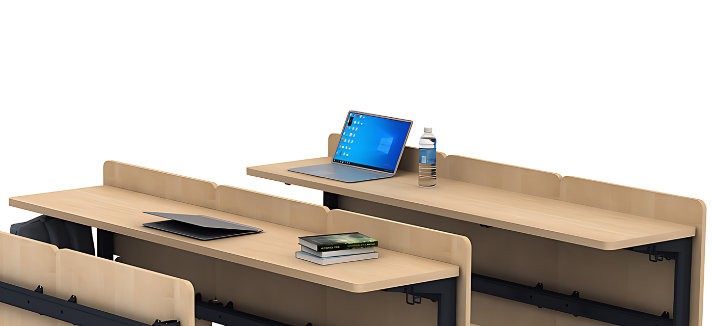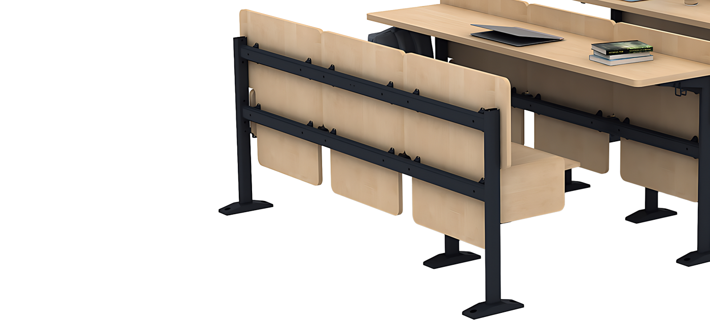 The intelligently engineered foldable seat mechanism allows seats to lift smoothly, maximizing aisle space and improving movement within the classroom. This compact design enhances room capacity, cleaning efficiency, and circulation during high-traffic periods.