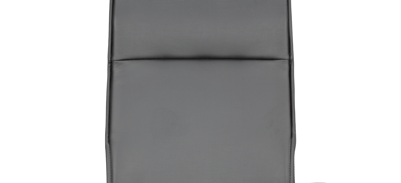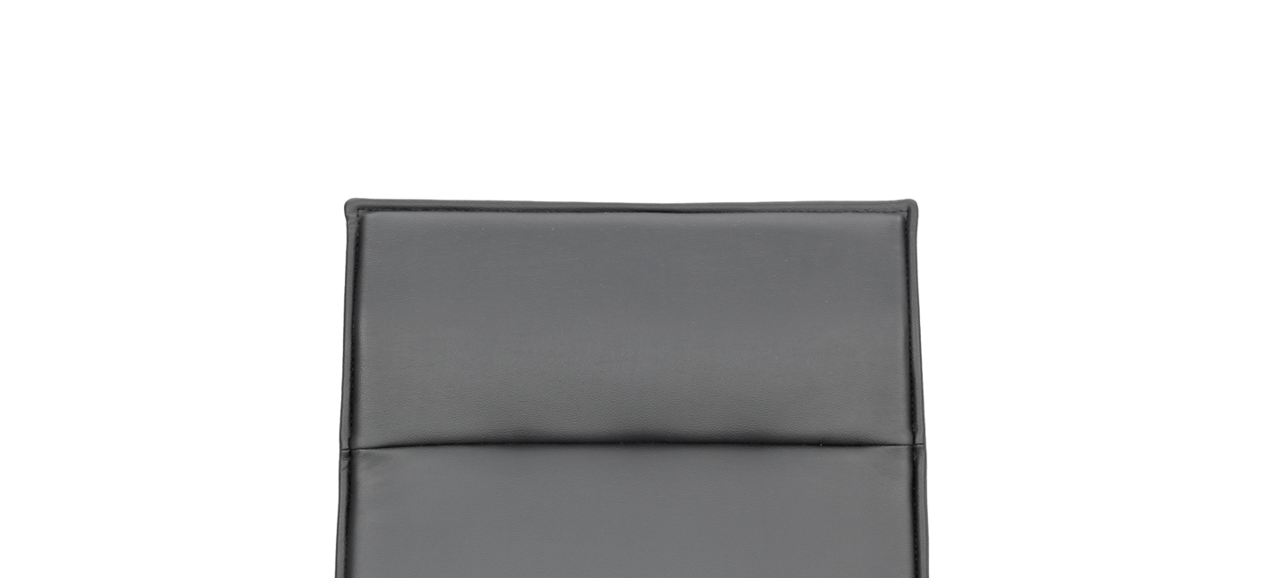 The chair’s pronounced lines frame a smooth leatherette back, flowing seamlessly down to a sleek chrome base.