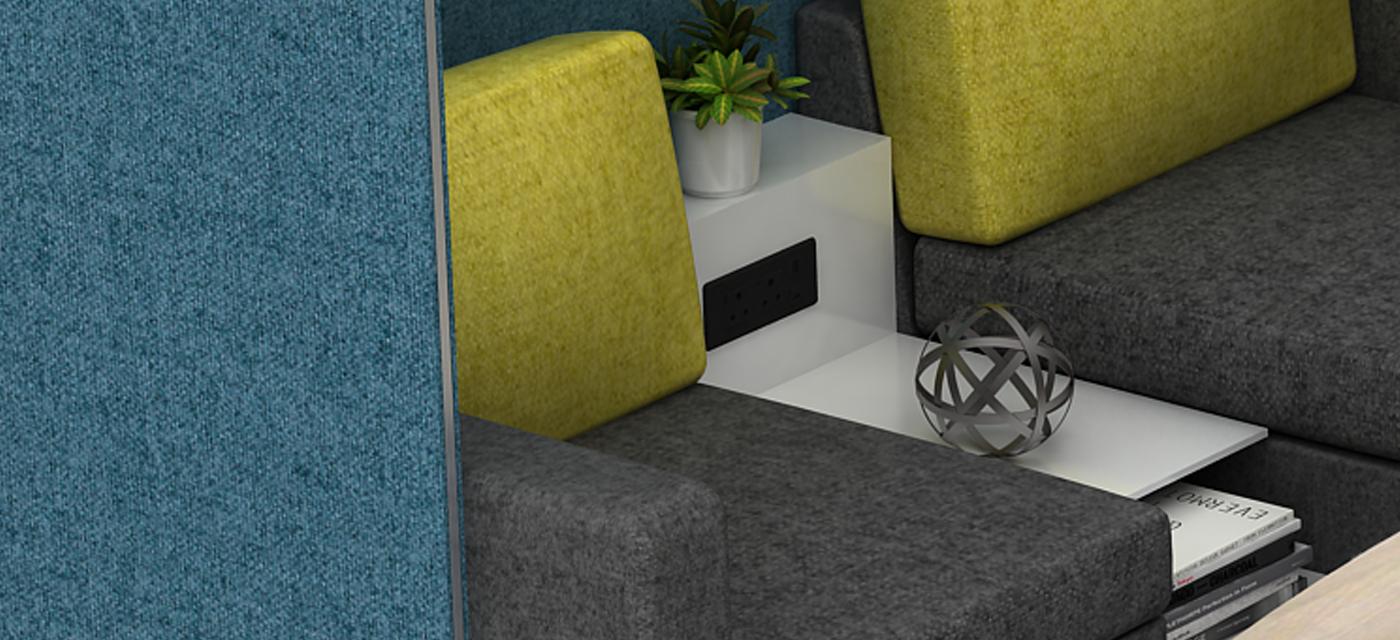 A sleek built-in storage console sits between the Omega Sofa seats, providing easy access to everyday essentials. Combined with integrated charging ports, it enhances comfort and efficiency for both focused tasks and collaborative sessions.