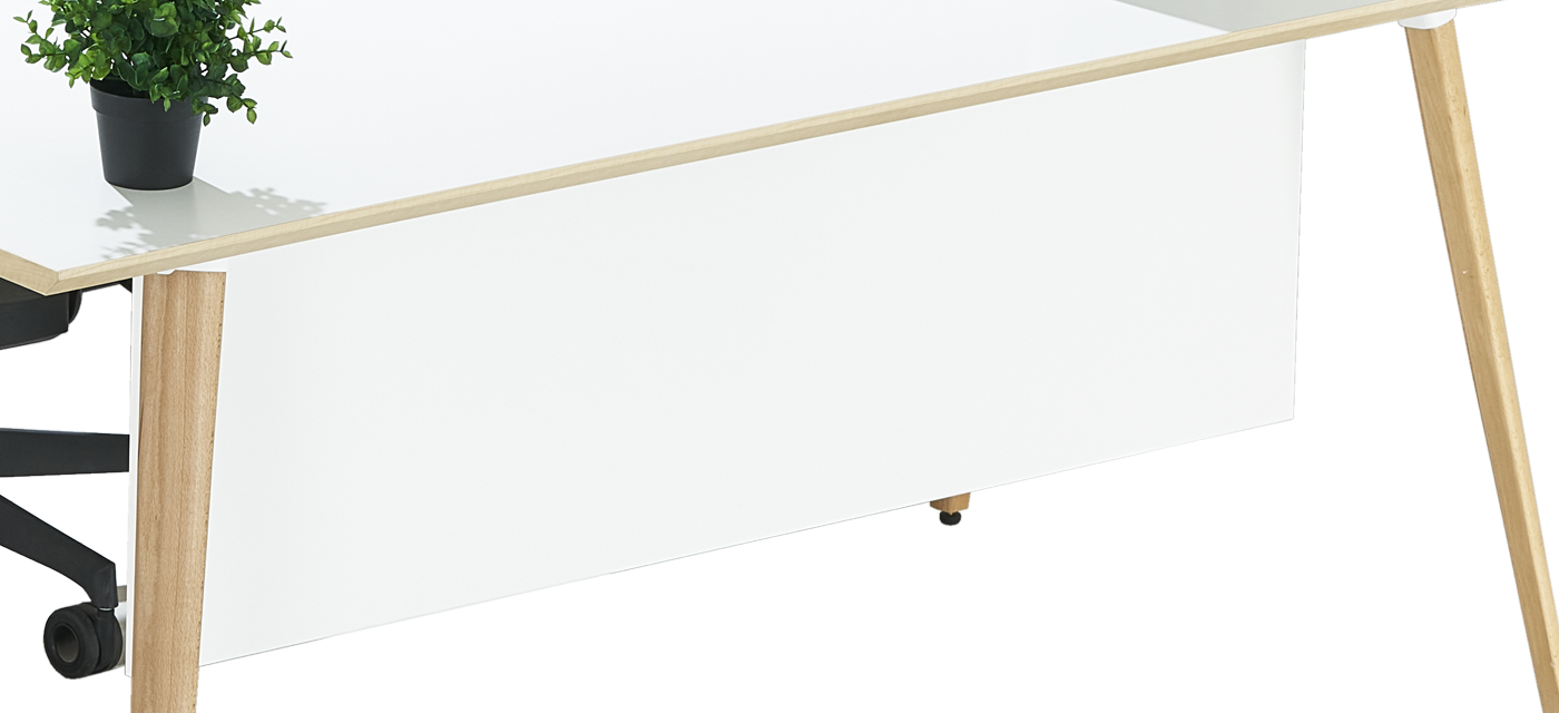 The modesty panel adds both visual balance and privacy to the design. Its clean lines and matching laminate finish create a cohesive look, complementing the table’s modern structure.
